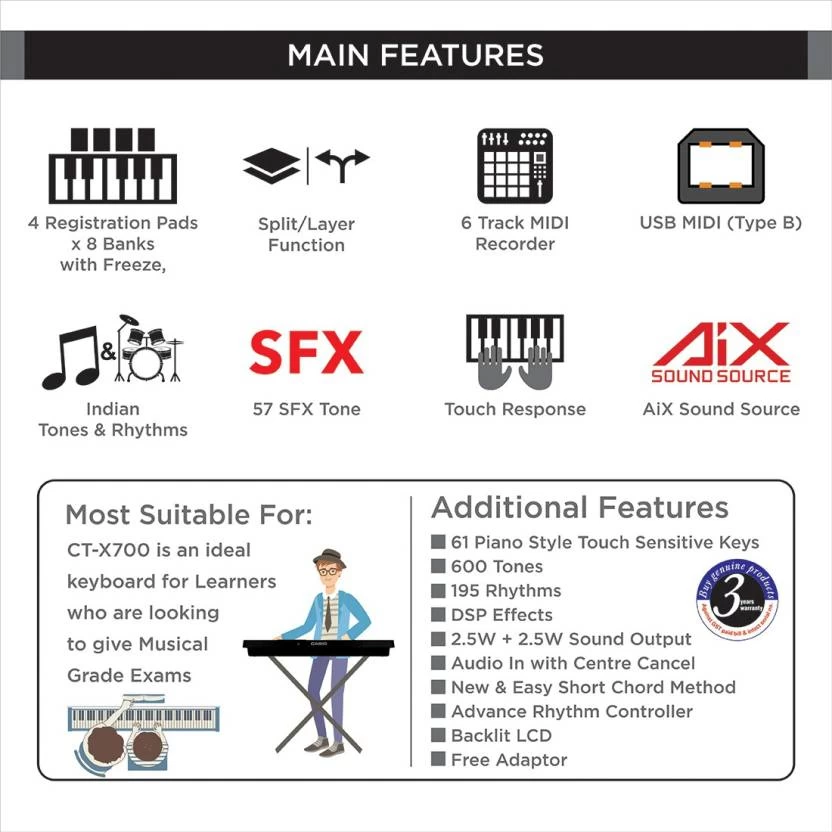 This stylish Casio Digital Portable Keyboard has 61 Piano-style Keys that help give you a piano-like feel while pressing the keys. It comes with a Touch Toggle Button that has 3 sensitivity levels to ensure ease of use. This keyboard comes with an Audio Input Port that lets you use it as a playback device so that you can play along with your favourite songs. With many Built-in Songs, you can easily learn to play different tracks for your loved ones.