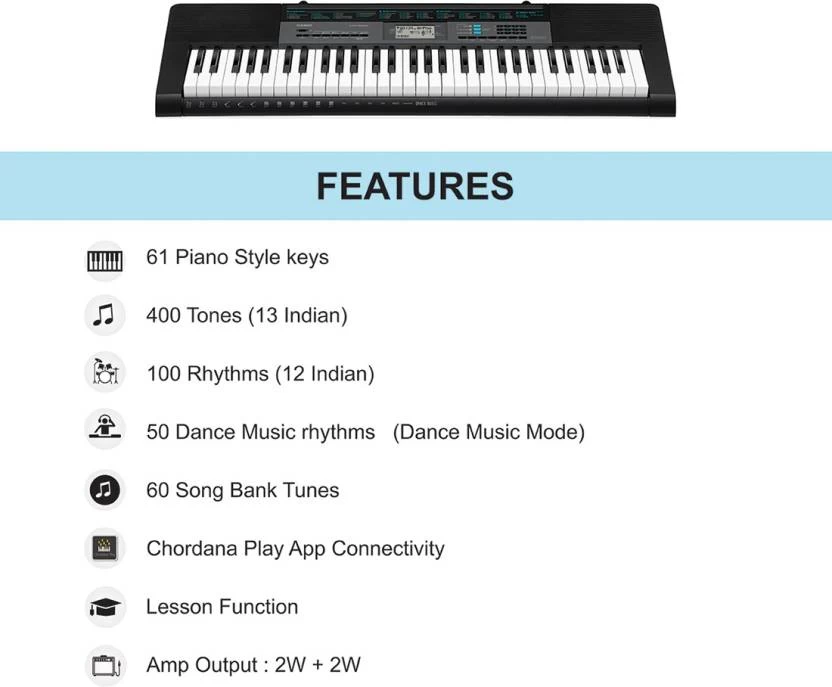 This Casio CTK-2550 Portable Digital Keyboard comes with 61 full-size piano-style keys, 400 high-quality tones, and 150 rhythms that make sure that the music never stops around you. Its lightweight design and Dance Music Mode will help you play musical tracks (that you created) at various social events – without a hassle.
